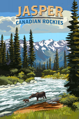 Jasper, Canada - Canadian Rockies - Moose & River Rapids - Lantern Press Artwork