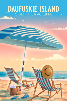 Daufuskie Island, South Carolina - Lithograph - Beach Umbrella & Chair