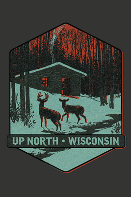 Up North, Wisconsin - Deer & Cabin in Winter - Woodblock - Contour - Lantern Press Artwork