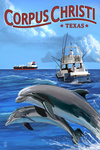 Corpus Christi, Texas - Fishing Boat with Freighter and Dolphins - Lantern Press Artwork