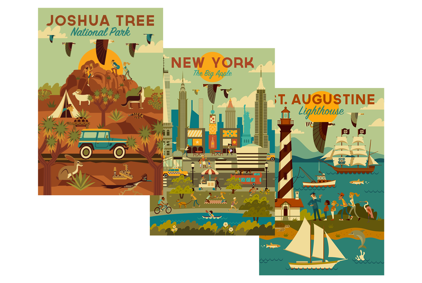Inspired by WPA posters from the first half of the 20th century, this versatile art style features strong, glowing locations with subtle texture and shading. It’s finished with a name drop that’s a perfect stylistic match.